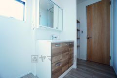 三面鏡つき洗面台。鏡裏にたっぷりとした収納スペースがあります。鏡を閉めてしまえば小物は見えないため、スッキリとした印象の洗面台にできます。