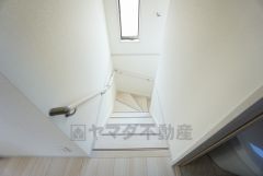 小さなお子様やご高齢の方でも安心できる、手すり付き階段。段差も低めで設定されており、安全性にも優れています。