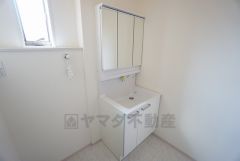三面鏡つき洗面台。鏡裏にたっぷりとした収納スペースがあります。鏡を閉めてしまえば小物は見えないため、スッキリとした印象の洗面台にできます。