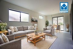 家具はイメージです。大きな窓のあるリビングは、陽光あふれる明るい空間です。居心地良く、ご家族皆がゆったり寛げる憩いの空間となりそうです。