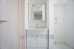 三面鏡つき洗面台。鏡裏にたっぷりとした収納スペースがあります。鏡を閉めてしまえば小物は見えないため、スッキリとした印象の洗面台にできます。