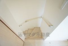小さなお子様やご高齢の方でも安心できる、手すり付き階段。段差も低めで設定されており、安全性にも優れています。