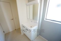 三面鏡つき洗面台。鏡裏にたっぷりとした収納スペースがあります。鏡を閉めてしまえば小物は見えないため、スッキリとした印象の洗面台にできます。