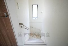 小さなお子様やご高齢の方でも安心できる、手すり付き階段。段差も低めで設定されており、安全性にも優れています。