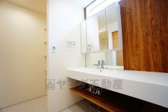 三面鏡つき洗面台。鏡裏にたっぷりとした収納スペースがあります。鏡を閉めてしまえば小物は見えないため、スッキリとした印象の洗面台にできます。
