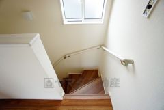 小さなお子様やご高齢の方でも安心できる、手すり付き階段。段差も低めで設定されており、安全性にも優れています。