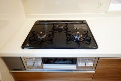 同時にたくさんの料理が調理できる3口コンロ。長時間熱を通しておきたい煮込み料理を作りながら、炒め物など同時進行で進められます。