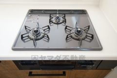 同仕様写真。同時にたくさんの料理が調理できる3口コンロ。長時間熱を通しておきたい煮込み料理を作りながら、炒め物など同時進行で進められます。