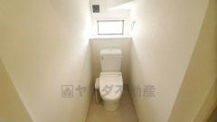 温水洗浄機付トイレです。節水機能もあるので、安心して使えますね。もちろん、1階2階の2ヶ所にトイレがあるので、忙しい朝にもゆとりができますね。