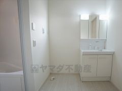同仕様写真。三面鏡つき洗面台。鏡裏にたっぷりとした収納スペースがあります。鏡を閉めてしまえば小物は見えないため、スッキリとした印象の洗面台にできます。