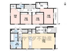 4LDKとウォークインクローゼットでゆとりのある暮らしが実現。リビングは17帖以上の開放感あふれる空間です。2階は洋室が4部屋あるので、お子様が大きくなっても安心ですね^^