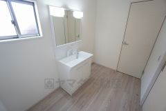 同仕様写真。三面鏡つき洗面台。鏡裏にたっぷりとした収納スペースがあります。鏡を閉めてしまえば小物は見えないため、スッキリとした印象の洗面台にできます。