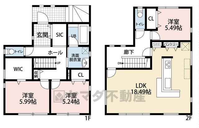 洋5.2畳(1F)、洋5.9畳(1F)、洋5.4畳(2F)、LDK18.4畳(2F) |