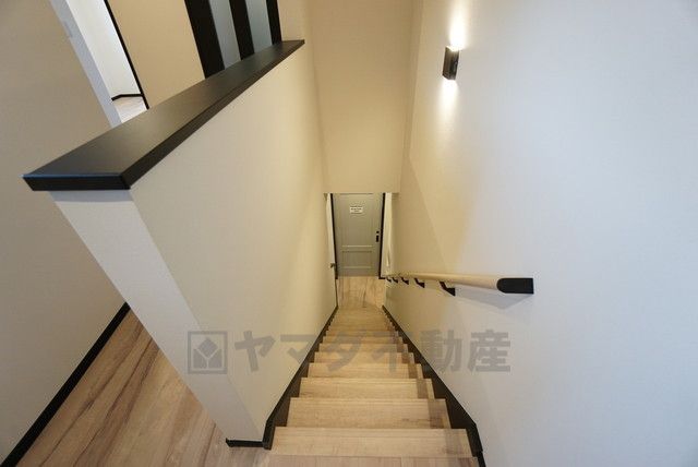 小さなお子様やご高齢の方でも安心できる、手すり付き階段。段差も低めで設定されており、安全性にも優れています。