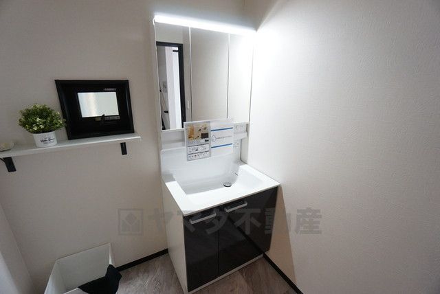 三面鏡つき洗面台。鏡裏にたっぷりとした収納スペースがあります。鏡を閉めてしまえば小物は見えないため、スッキリとした印象の洗面台にできます。