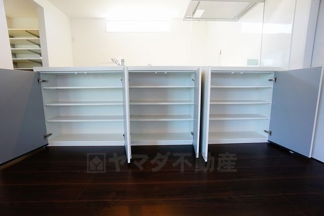 キッチンカウンター下に大容量の収納スペース有り。扉付きなので、中の荷物を来客に見られる心配がありません^^