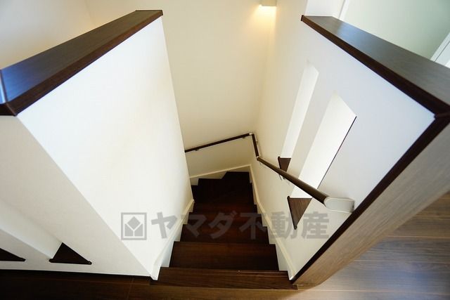 小さなお子様やご高齢の方でも安心できる、手すり付き階段。段差も低めで設定されており、安全性にも優れています。