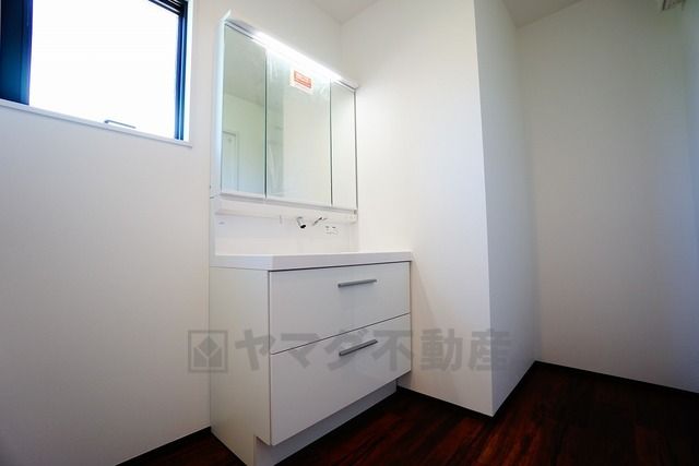 三面鏡つき洗面台。鏡裏にたっぷりとした収納スペースがあります。鏡を閉めてしまえば小物は見えないため、スッキリとした印象の洗面台にできます。