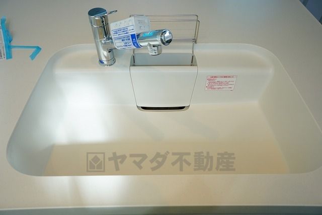 広々としたステンレスシンクには、洗剤やスポンジを収納出来るラック付き。広さも確保しているので、大きなお鍋も洗いやすいです。