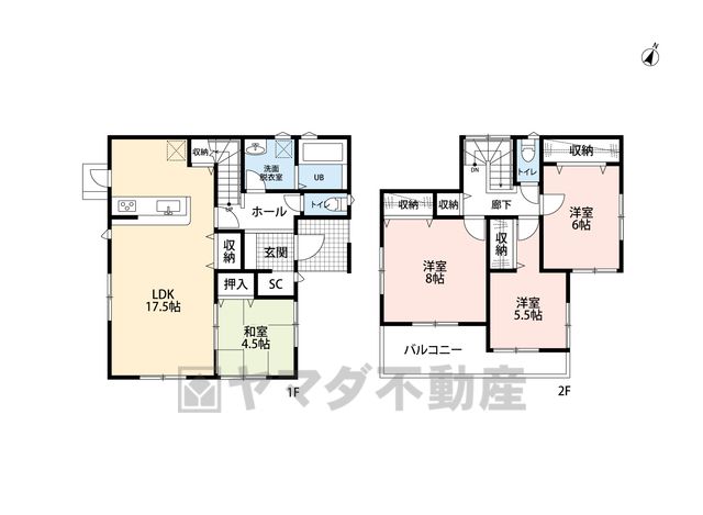 LDK17.5畳(1F)、和4.5畳(1F)、洋5.5畳(2F)、洋6畳(2F)、洋8畳(2F) |