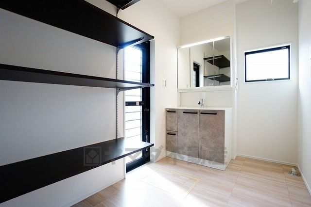 三面鏡つき洗面台。鏡裏にたっぷりとした収納スペースがあります。鏡を閉めてしまえば小物は見えないため、スッキリとした印象の洗面台にできます。