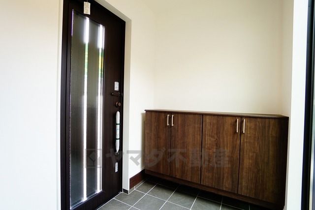 玄関ドアの正面には大きな窓があり、採光も考えられた明るい玄関です。棚の上にお花や写真を飾っても良いですね。