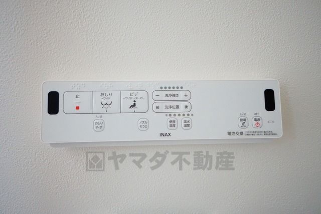 壁リモコンタイプのウォシュレット付き。すっきりした見た目で、トイレ奥の掃除もしやすいです。