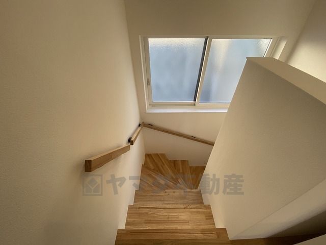 小さなお子様やご高齢の方でも安心できる、手すり付き階段。段差も低めで設定されており、安全性にも優れています。