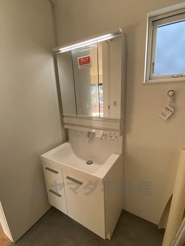 三面鏡つき洗面台。鏡裏にたっぷりとした収納スペースがあります。鏡を閉めてしまえば小物は見えないため、スッキリとした印象の洗面台にできます。