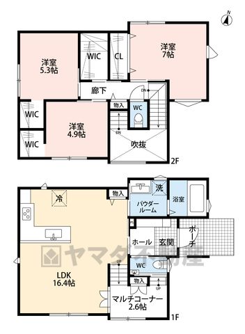 LDK16.4畳(1F)、洋4.9畳(2F)、洋5.3畳(2F)、洋7畳(2F) |