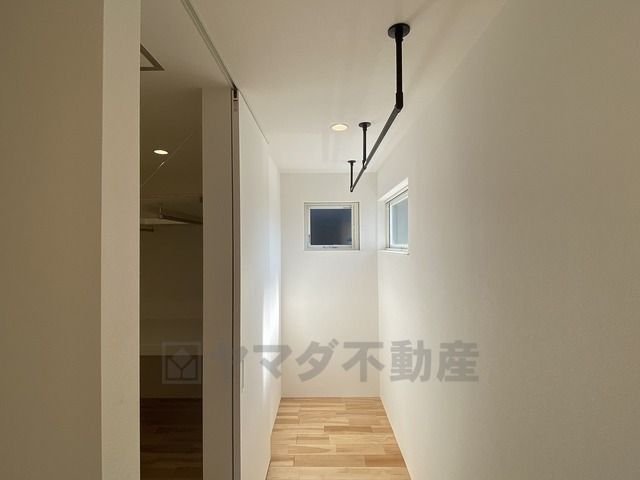 2階のドライスペース。室内干しができる物干し台が天井から設置されていて梅雨時期などにとても便利です。