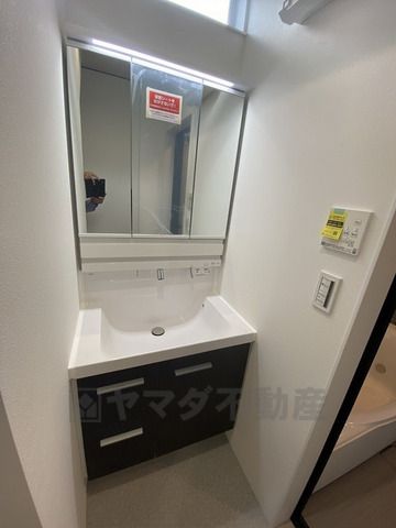 三面鏡つき洗面台。鏡裏にたっぷりとした収納スペースがあります。鏡を閉めてしまえば小物は見えないため、スッキリとした印象の洗面台にできます。