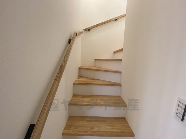 小さなお子様やご高齢の方でも安心できる、手すり付き階段。段差も低めで設定されており、安全性にも優れています。