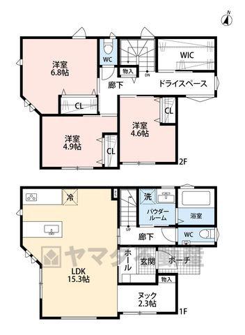 LDK15.3畳(1F)、洋4.9畳(2F)、洋4.6畳(2F)、洋6.8畳(2F) |