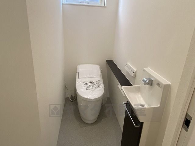 温水洗浄機付トイレです。節水機能もあるので、安心して使えますね。もちろん、1階2階の2ヶ所にトイレがあるので、忙しい朝にもゆとりができますね。