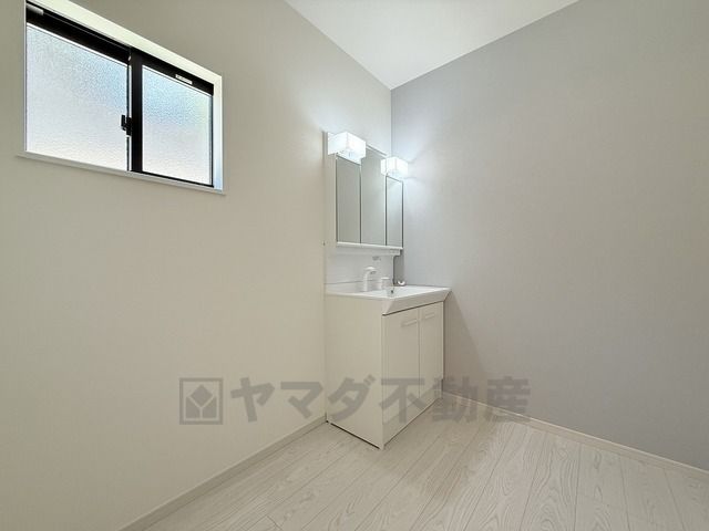 三面鏡つき洗面台。鏡裏にたっぷりとした収納スペースがあります。鏡を閉めてしまえば小物は見えないため、スッキリとした印象の洗面台にできます。