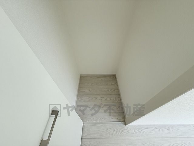 小さなお子様やご高齢の方でも安心できる、手すり付き階段。段差も低めで設定されており、安全性にも優れています。