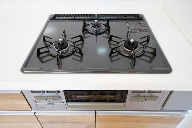 同時にたくさんの料理が調理できる3口コンロ。長時間熱を通しておきたい煮込み料理を作りながら、炒め物など同時進行で進められます。