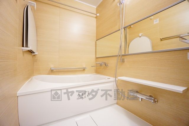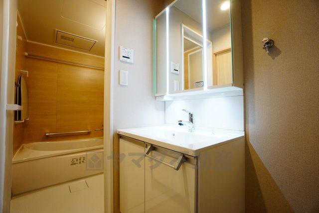横長の鏡が、空間に奥行をもたらし、広々としたバスルームを印象付けています。