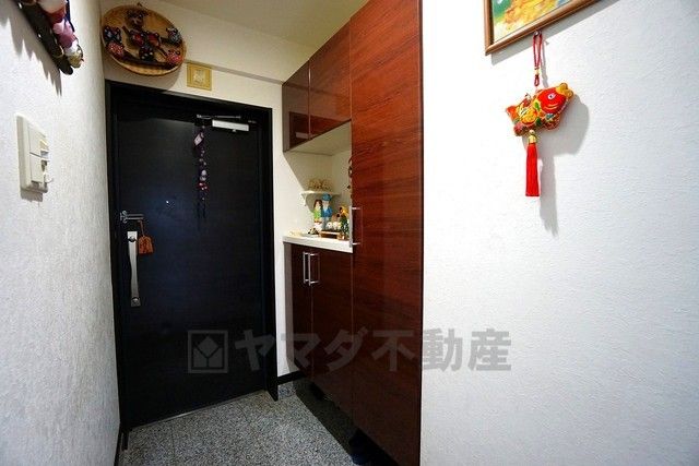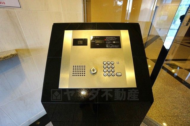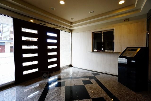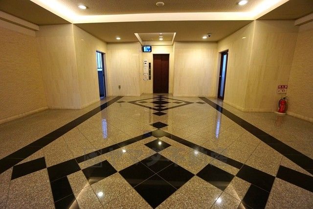 マンションのエントランスに防犯カメラ付き。大理石張りのお洒落なエントランスです。広々としたエントランスが開放感を演出しています。