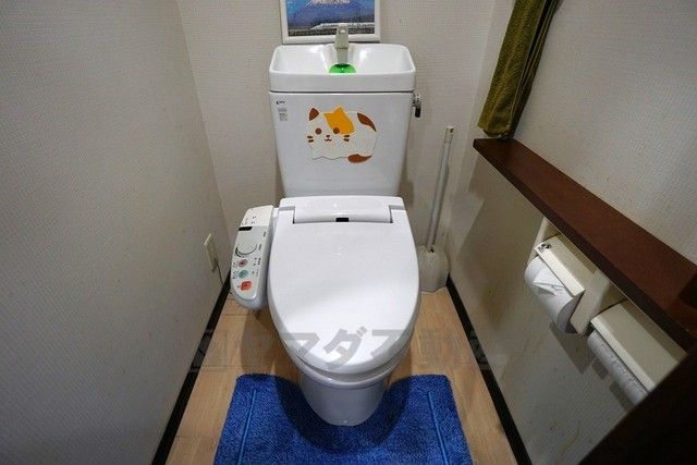 温水、暖房、ウォシュレット付の高機能トイレです。上部には便利な収納棚がついているので、スッキリとした空間にできます^^