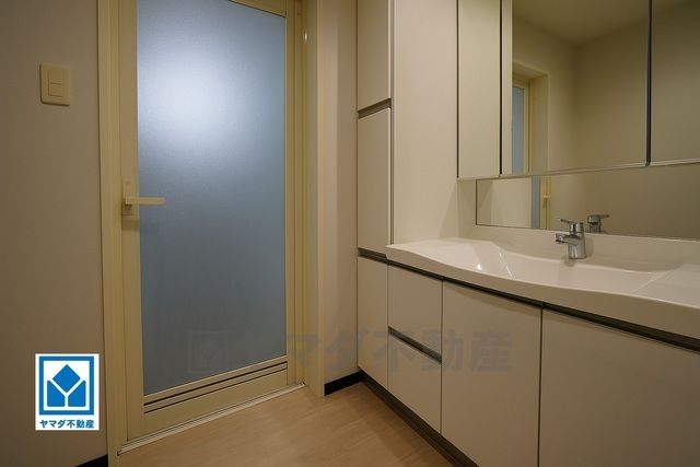 家具家電撤去後のイメージです。三面鏡つき洗面台。鏡裏にたっぷりとした収納スペースがあります。鏡を閉めてしまえば小物は見えないため、スッキリとした印象の洗面台にできます。