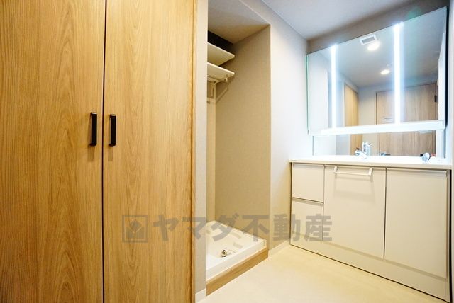 三面鏡つき洗面台。鏡裏にたっぷりとした収納スペースがあります。鏡を閉めてしまえば小物は見えないため、スッキリとした印象の洗面台にできます。