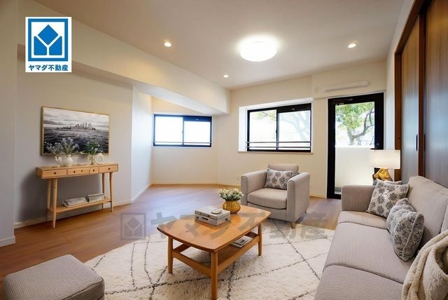 家具はイメージです。大きな窓のあるリビングは、陽光あふれる明るい空間です。居心地良く、ご家族皆がゆったり寛げる憩いの空間となりそうです。