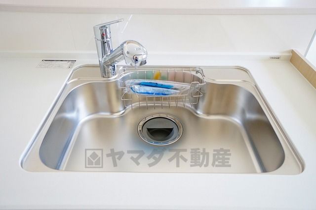 広々としたステンレスシンクには、洗剤やスポンジを収納出来るラック付き。広さも確保しているので、大きなお鍋も洗いやすいです。