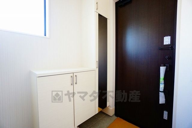 採光も考えられた明るい玄関です。シューズボックスは全身鏡付きで、お出かけ前にコーディネートのチェックが出来ますね。