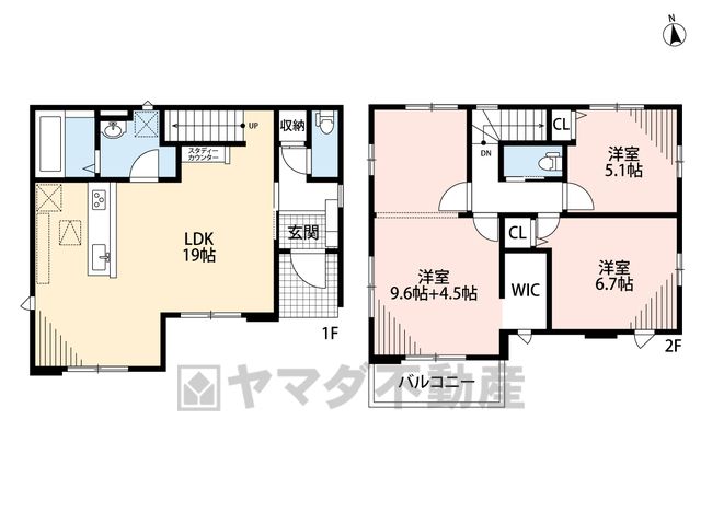 LDK19畳(1F)、洋5.1畳(2F)、洋6.7畳(2F)、洋14.1畳(2F) |