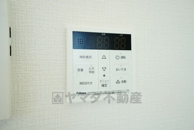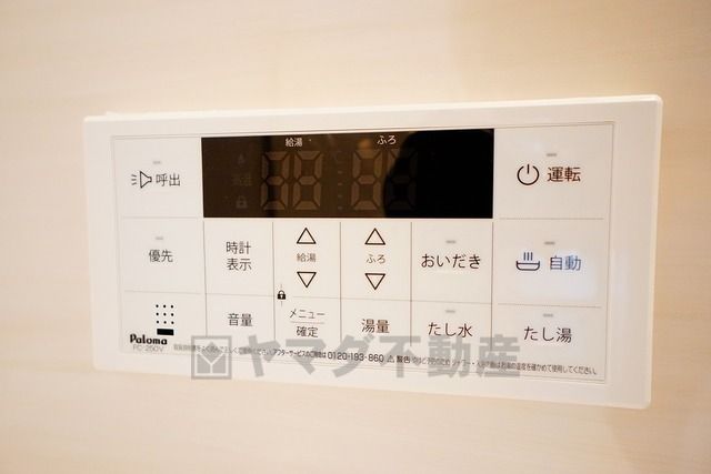 キッチン横からお湯張り、追い炊き、足し湯がボタン一つで楽々操作できる給湯機リモコンです。忙しい夕飯準備の時間帯に重宝しますね。
