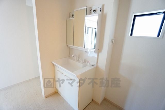 三面鏡つき洗面台。鏡裏にたっぷりとした収納スペースがあります。鏡を閉めてしまえば小物は見えないため、スッキリとした印象の洗面台にできます。