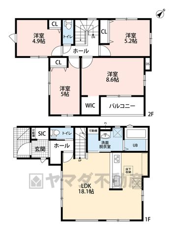 LDK18.1畳(1F)、洋4.9畳(2F)、洋5畳(2F)、洋5.2畳(2F)、洋8.6畳(2F) |